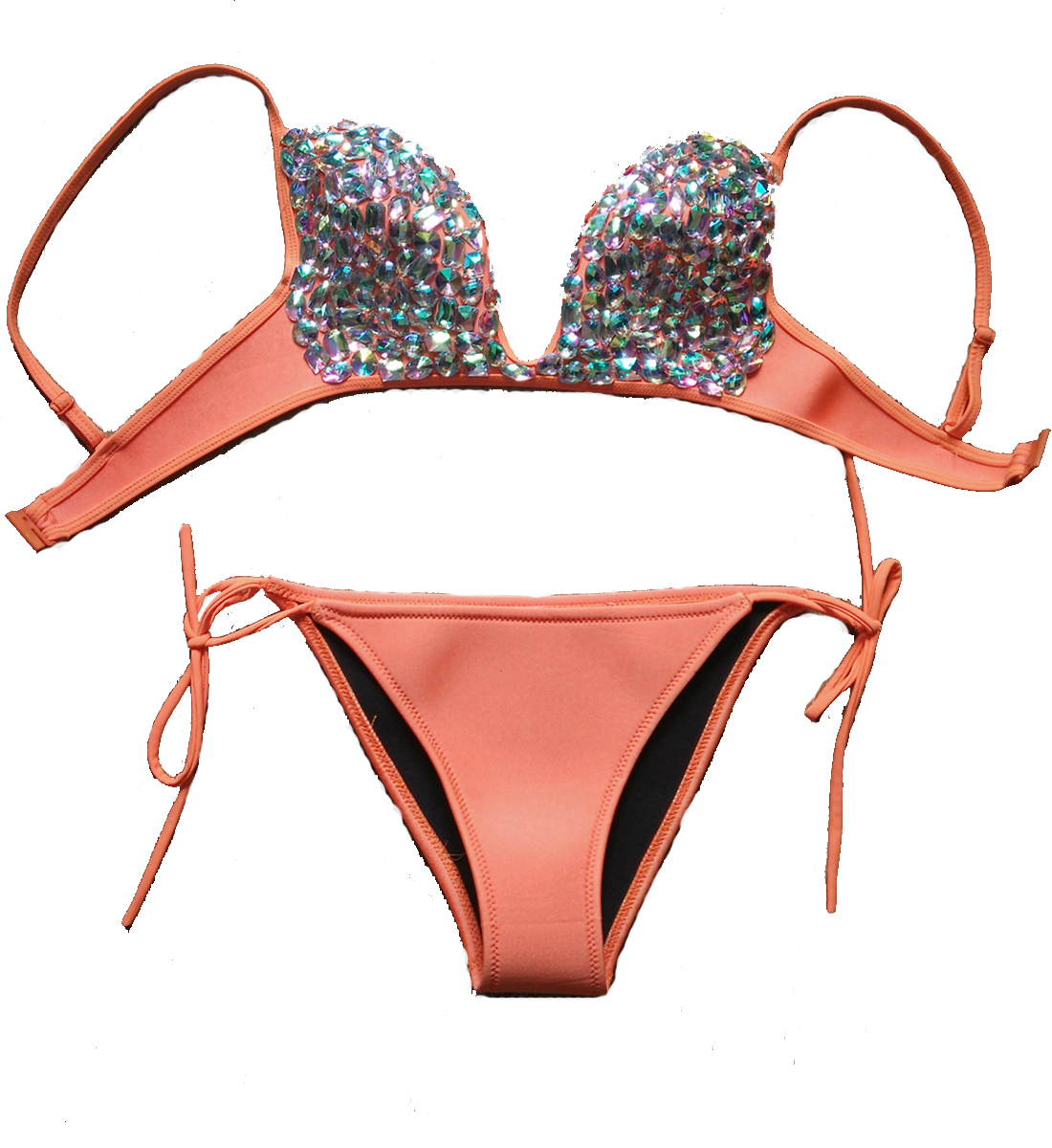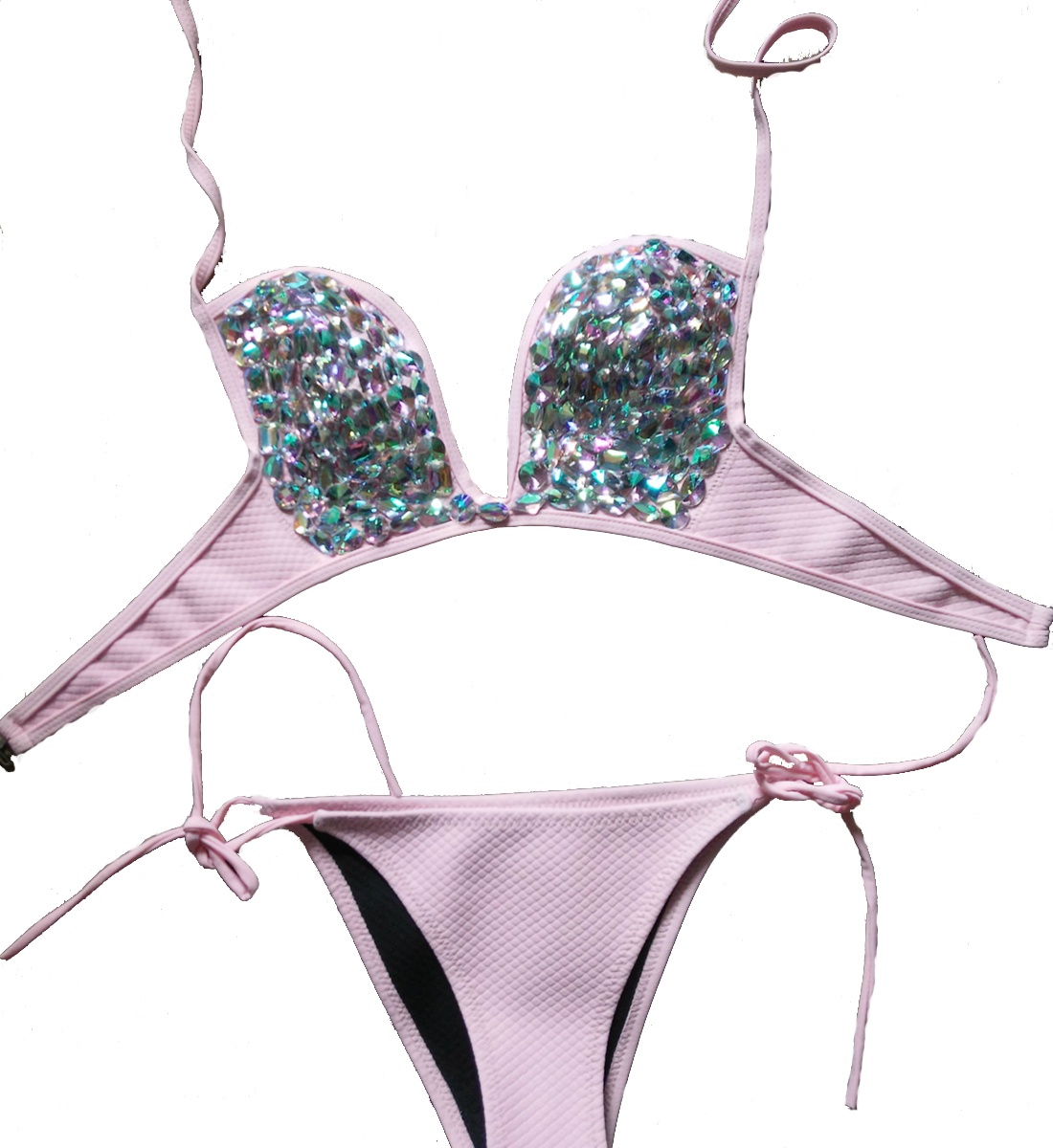 Hand sew rhinestone diamond No push-up padded Adjustable tie up top and bottom Triangle bottom, easy longer your legs Please check our size chart before placing order.