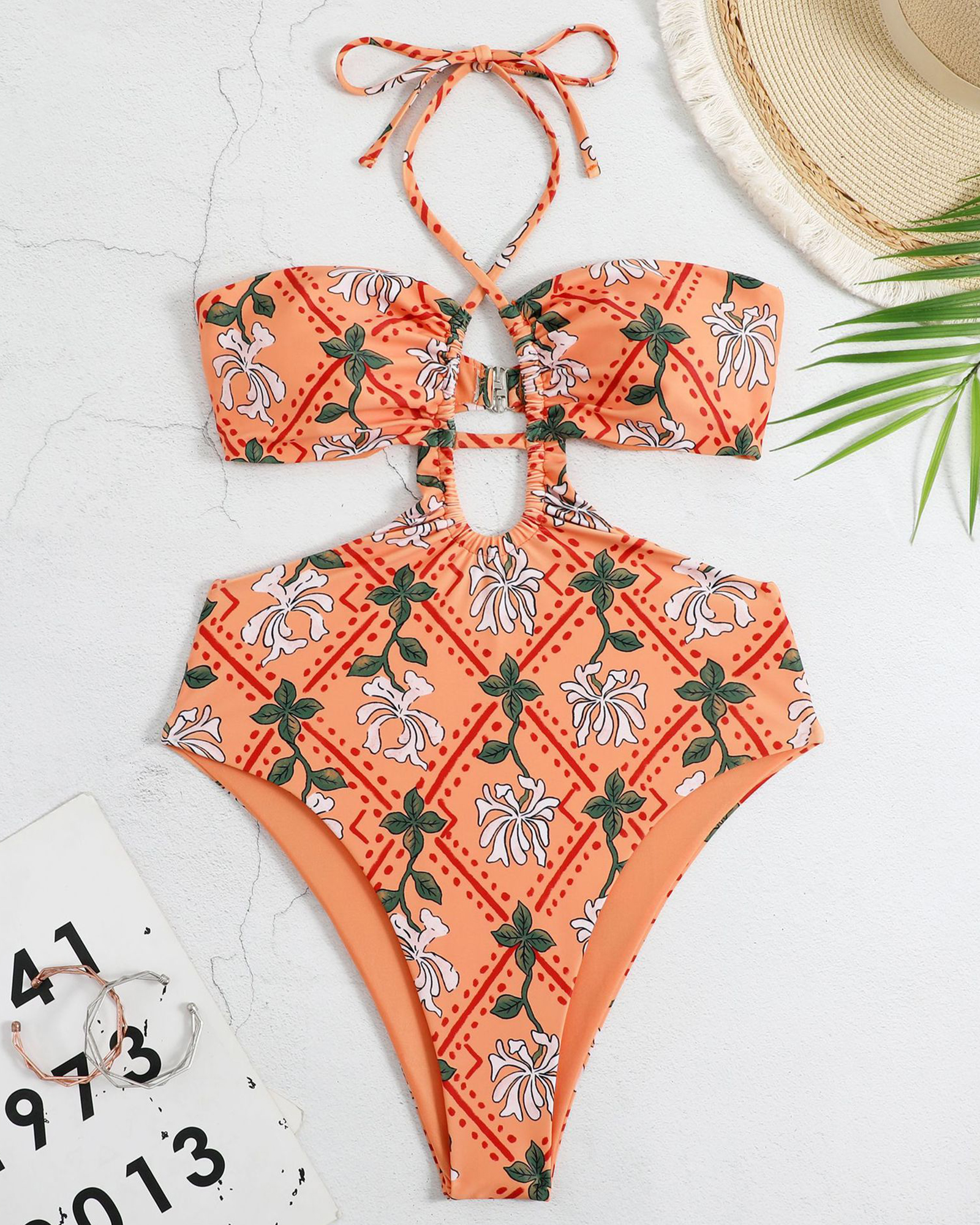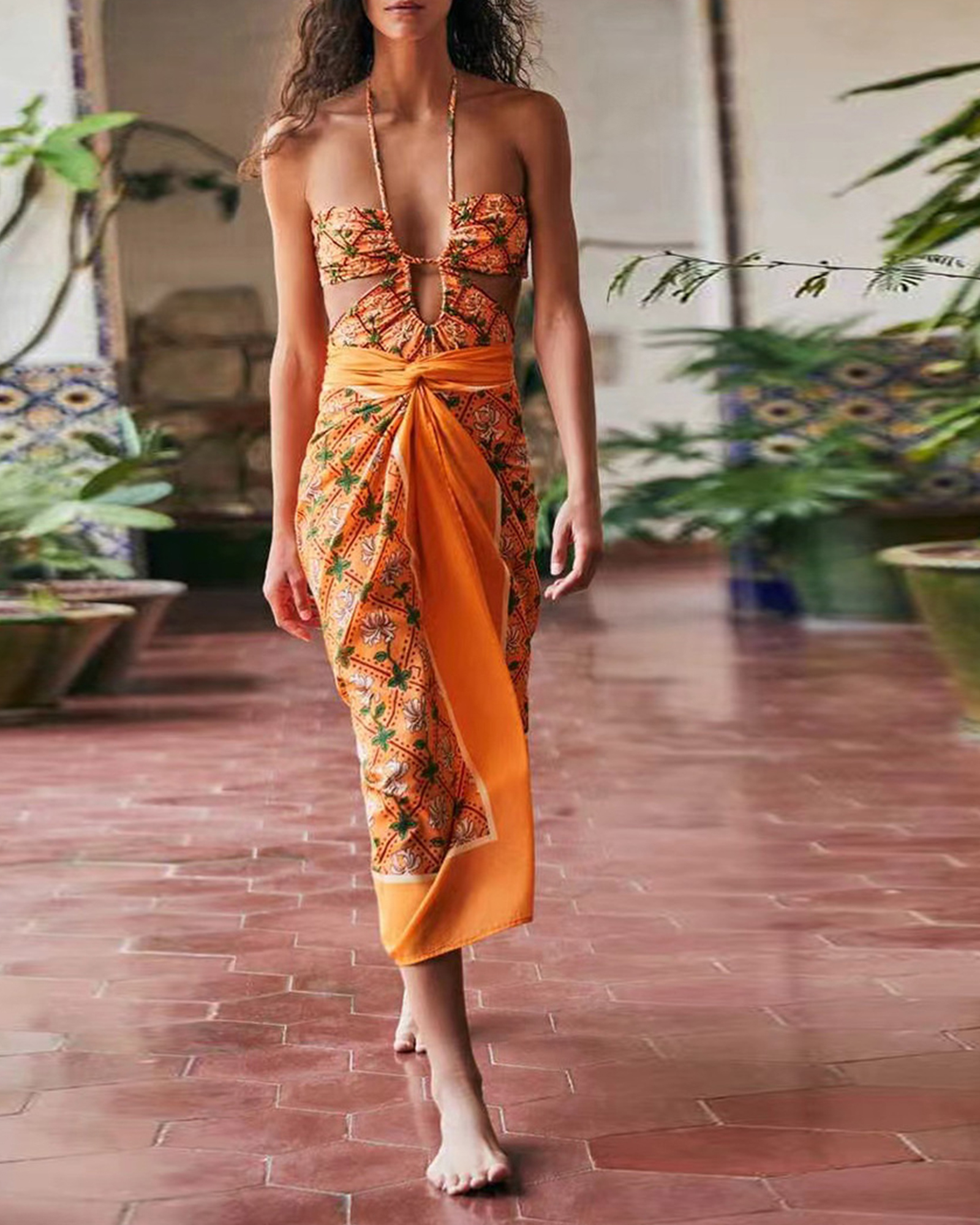 Cut Out Tie Fastening Halter Orange Printed Swimsuit Women Sarong Coverup