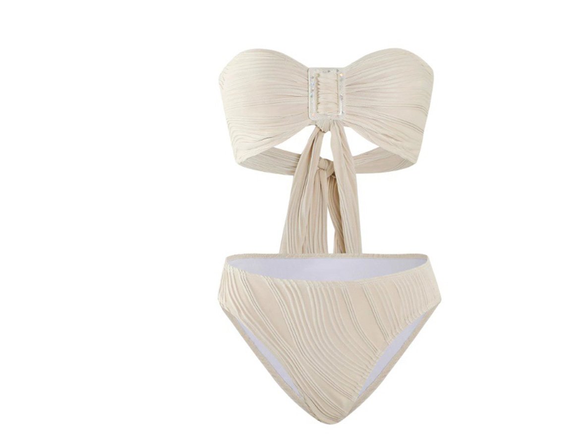 Embrace the allure of this chic and captivating cream white strapless bikini set. The bandeau top features a flattering sweetheart neckline with intricate ruching and a bow detail at the center, offering a touch of feminine elegance. The high-waisted bottoms complement the top perfectly, with their sleek and streamlined silhouette. Crafted from a lightweight and breathable fabric, this two-piece swimsuit provides both comfort and style for your beach or poolside adventures. With its timeless design and versatile hue, this bikini set is a must-have addition to your summer wardrobe. Pair it with your favorite sandals or a lightweight coverup for a effortlessly chic look.
