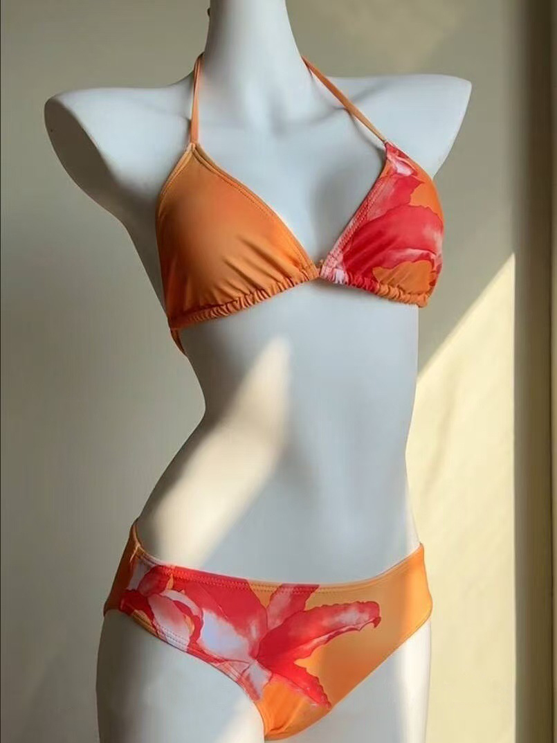 The ensemble features a flattering triangle bikini top in a mesmerizing orange and coral watercolor print, paired with matching bikini bottoms. The coordinating full-length sarong wrap showcases the same striking pattern with elegant ruched detailing along the sides, offering versatile styling options. The tropical-inspired design is enhanced with a decorative flower accent that adds a feminine touch to the ensemble. Perfect for resort wear or summer vacations, this swimsuit set combines style with functionality. The triangle top provides adjustable coverage with tie straps, while the sarong can be worn multiple ways to create different looks. The vibrant orange and coral hues blend seamlessly in an artistic watercolor pattern that catches the eye and flatters many skin tones. This versatile set transitions effortlessly from poolside lounging to beachfront dining when paired with your favorite accessories.