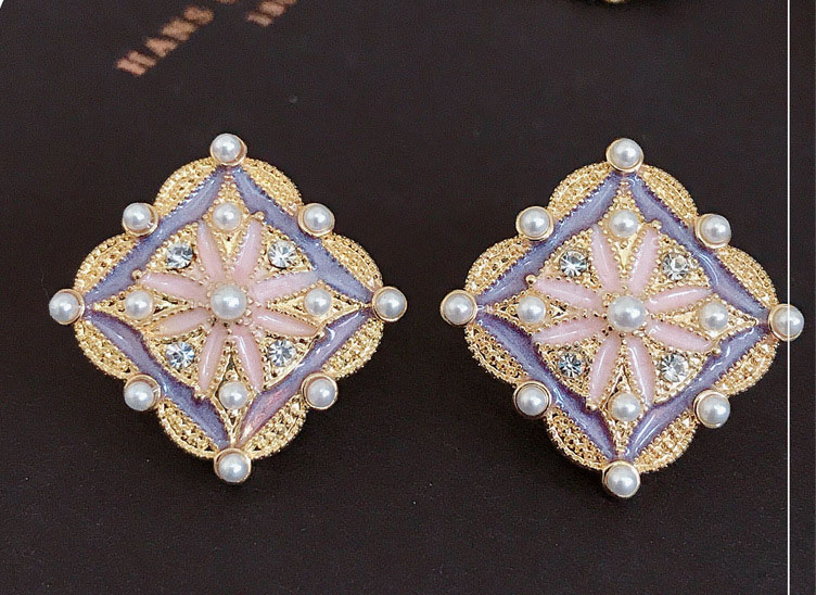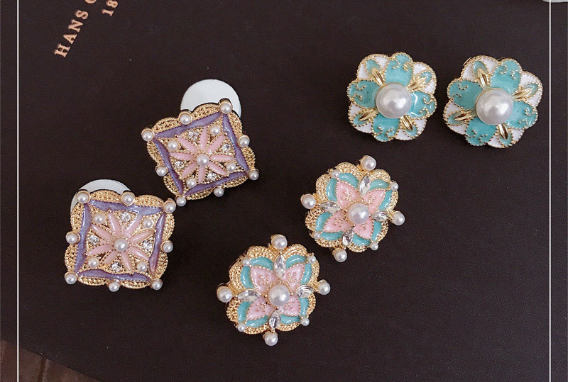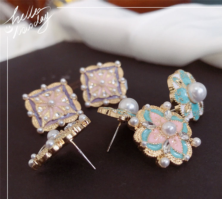 Baroque Pastel Enamel Floral Studs Earrings Square Tiny Dangle Drop Earring