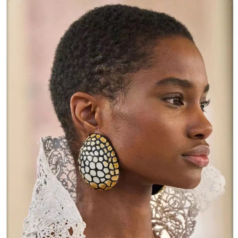 These stunning oversized teardrop earrings make a bold statement with their distinctive polka dot enamel pattern. Featuring an elegant egg shape design, each earring showcases a sophisticated blend of white and gold tones with intricate dotted detailing that creates a luxurious textured appearance. The generous size (approximately 2.2 inches by 1.8 inches) ensures these earrings won't go unnoticed, making them perfect for special occasions or adding drama to your everyday look. The enamel finish provides a smooth, lustrous surface that catches the light beautifully, while the golden accents add warmth and richness to the overall design. These statement earrings embody elegance and sophistication, offering a perfect balance between contemporary style and timeless appeal. Whether you're dressing up for an evening event or elevating a casual outfit, these eye-catching pieces will add instant glamour and personality to your ensemble. The unique pattern and substantial presence make these earrings a versatile accessory that pairs beautifully with both solid colors and patterned clothing.