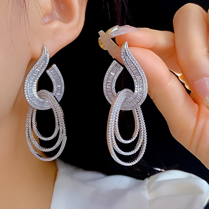 These luxury geometric zircon drop earrings are designed to make a dazzling statement. Featuring an intricate interlocking design with multiple cascading loops, these sparkly eardrops showcase brilliant zircon stones that catch the light from every angle. The sophisticated geometric pattern creates a bold, contemporary look that's perfect for brides seeking show-stopping accessories or anyone wanting to elevate their evening ensemble. Each earring is meticulously crafted with premium materials and features an S925 sterling silver needle for comfortable, secure wear. The exaggerated silhouette adds drama and elegance, making these earrings ideal for weddings, formal events, or special occasions where you want to shine. Available in both gold-tone and silver-tone finishes, these statement pieces combine luxurious sparkle with modern design. The generous length and eye-catching geometry ensure you'll turn heads wherever you go.