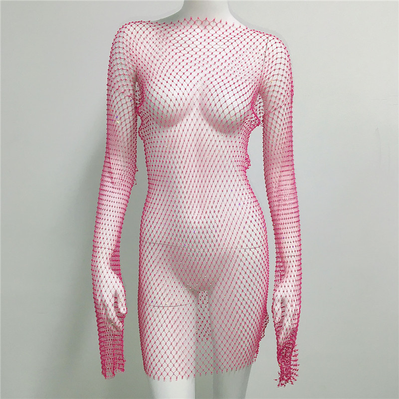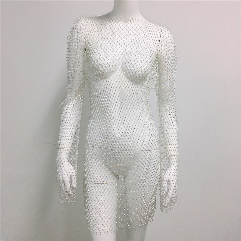 Embellished Fishnet Mini Dress with Long Sleeves Hollow out Bikini Overlay