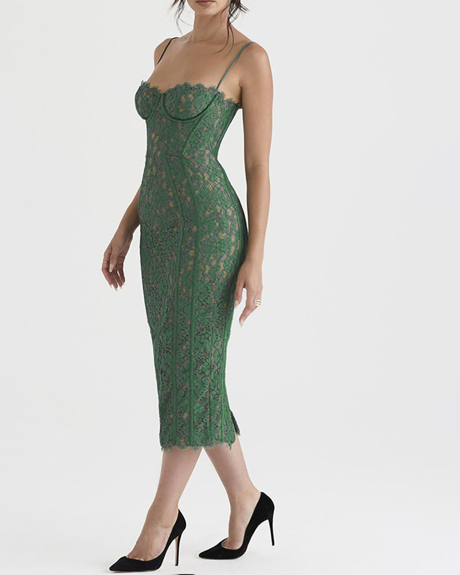 Green Lace Underwired Bodycon Suspender Mid-length Dress with Back Slit Supportive One-Step Skirt