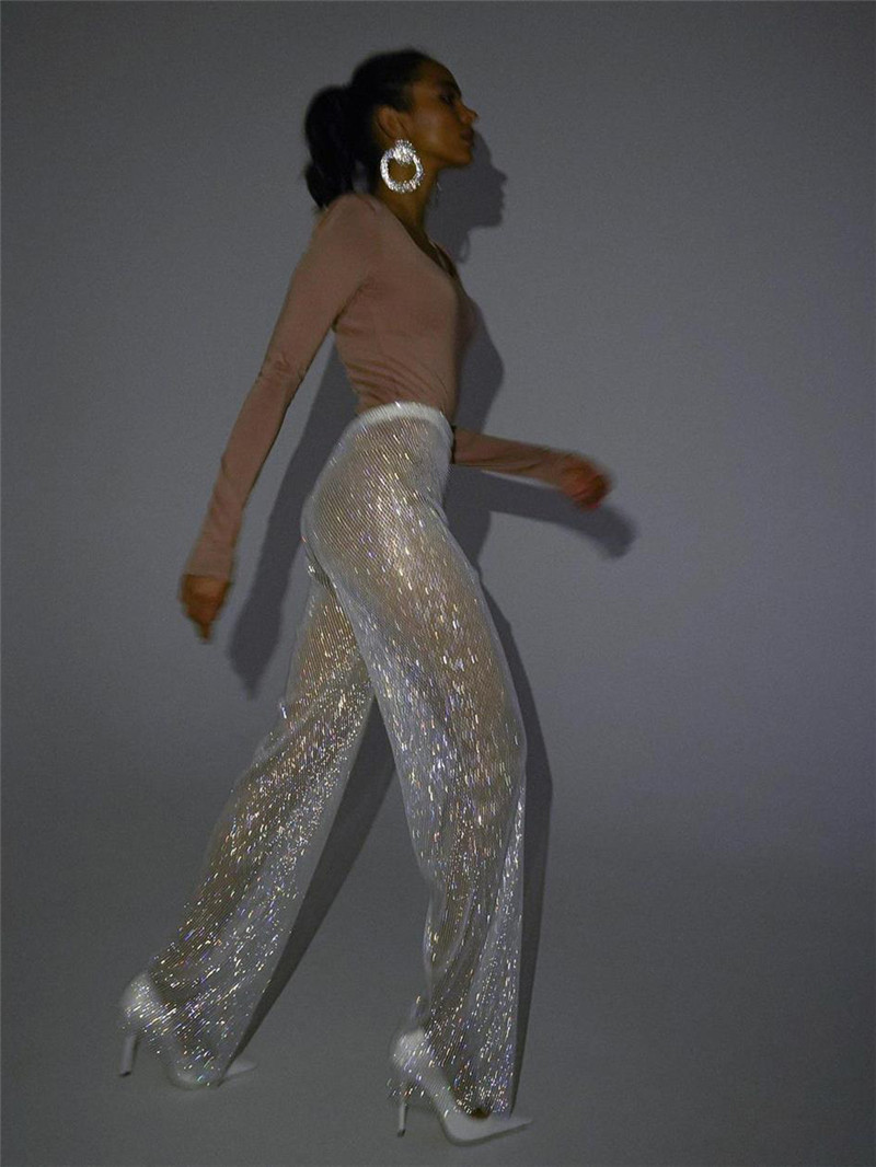 Embellished club pant, made of knit fabric with rhinestone throughout, unlined and elastic waist band, provocative sheer mesh, playful yet classy, sexy yet nonchalant. Creat party atmosphere, make one confident and filled up with light and festival mood.