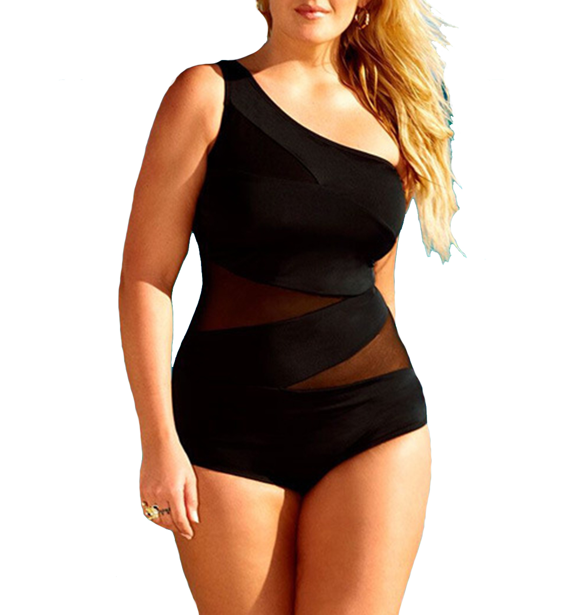 Women Plus Size Black One Shoulder Mesh One Pieces Swimsuit Curve Apparel Swimwear