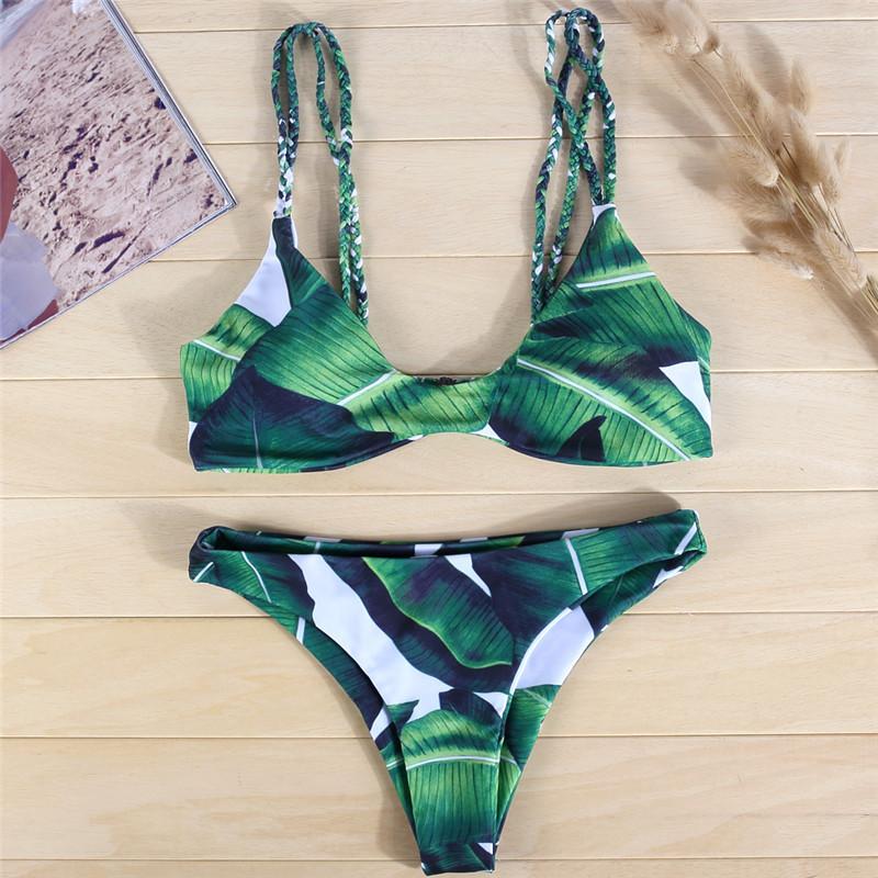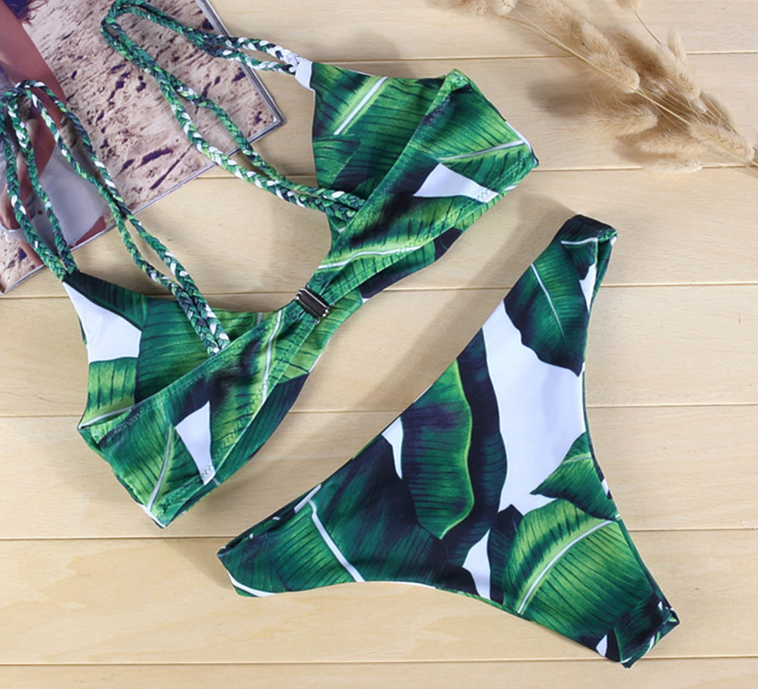 Green Printed Swimsuits for Women Hawaiian Style 2 Pieces Thong Bikini