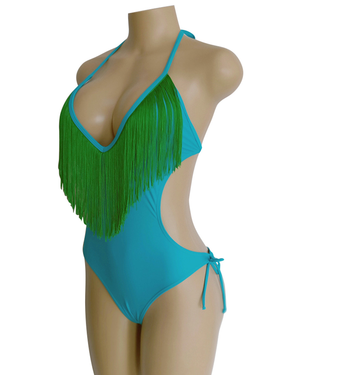 Women Monokini with Fringe Down V-Neckline Cut Out Waist Open Back Swimsuit
