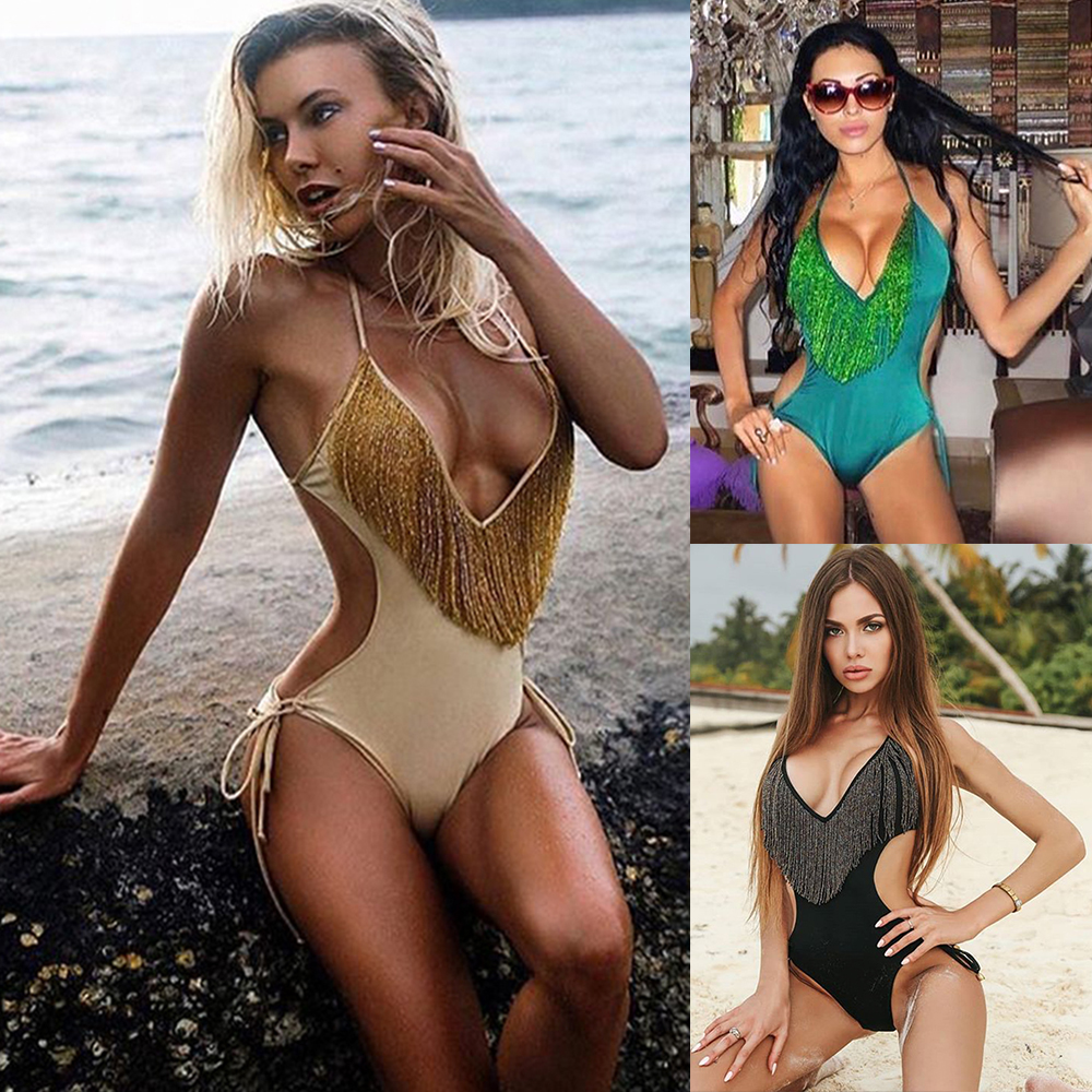 Tie up closure, this plunge v-neck one piece swimwear decorated with fringe dwon on the top, comfortable fit and chic at same time. Size from S to XL in black, champagne and teal color option, so flattering.