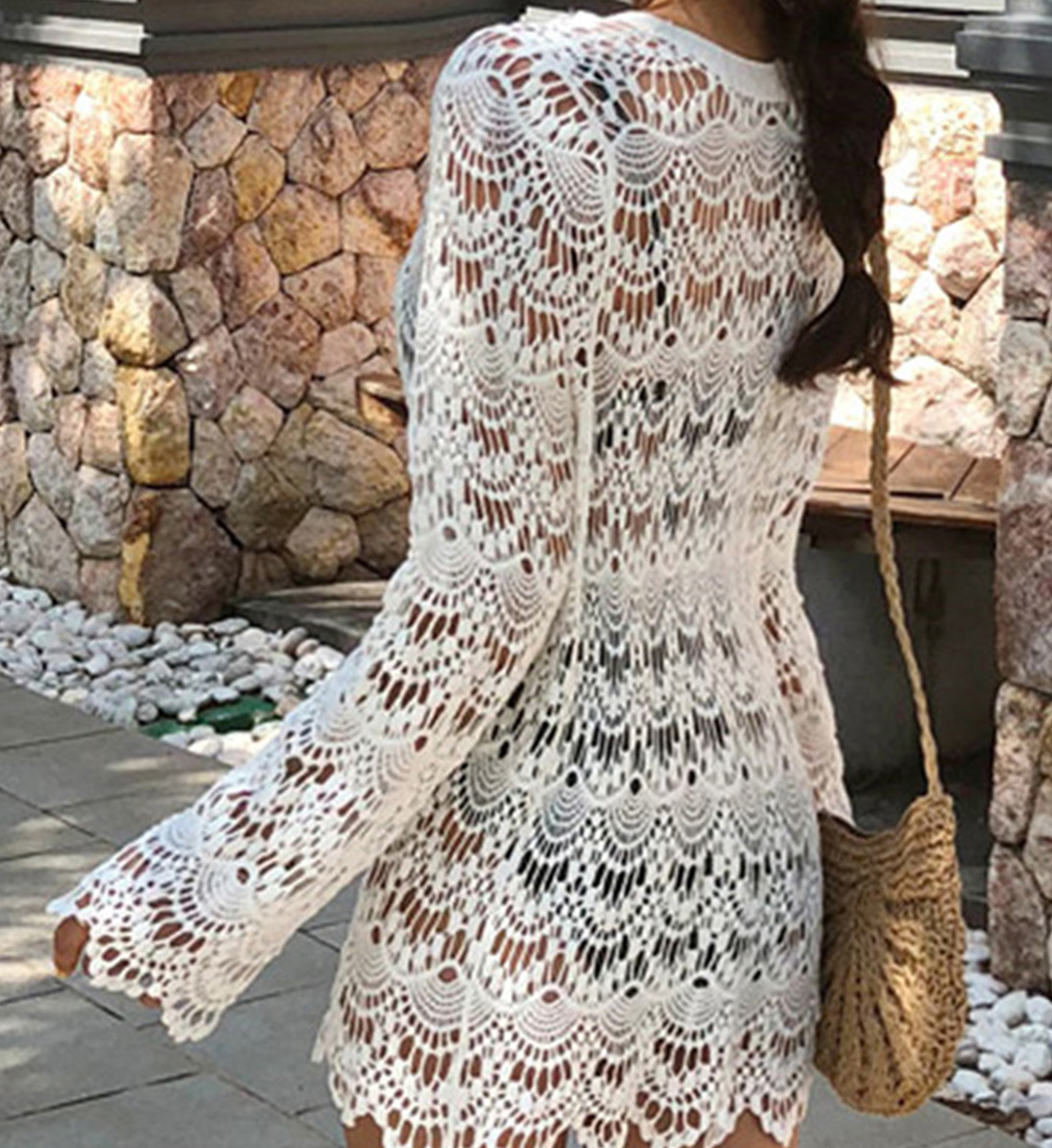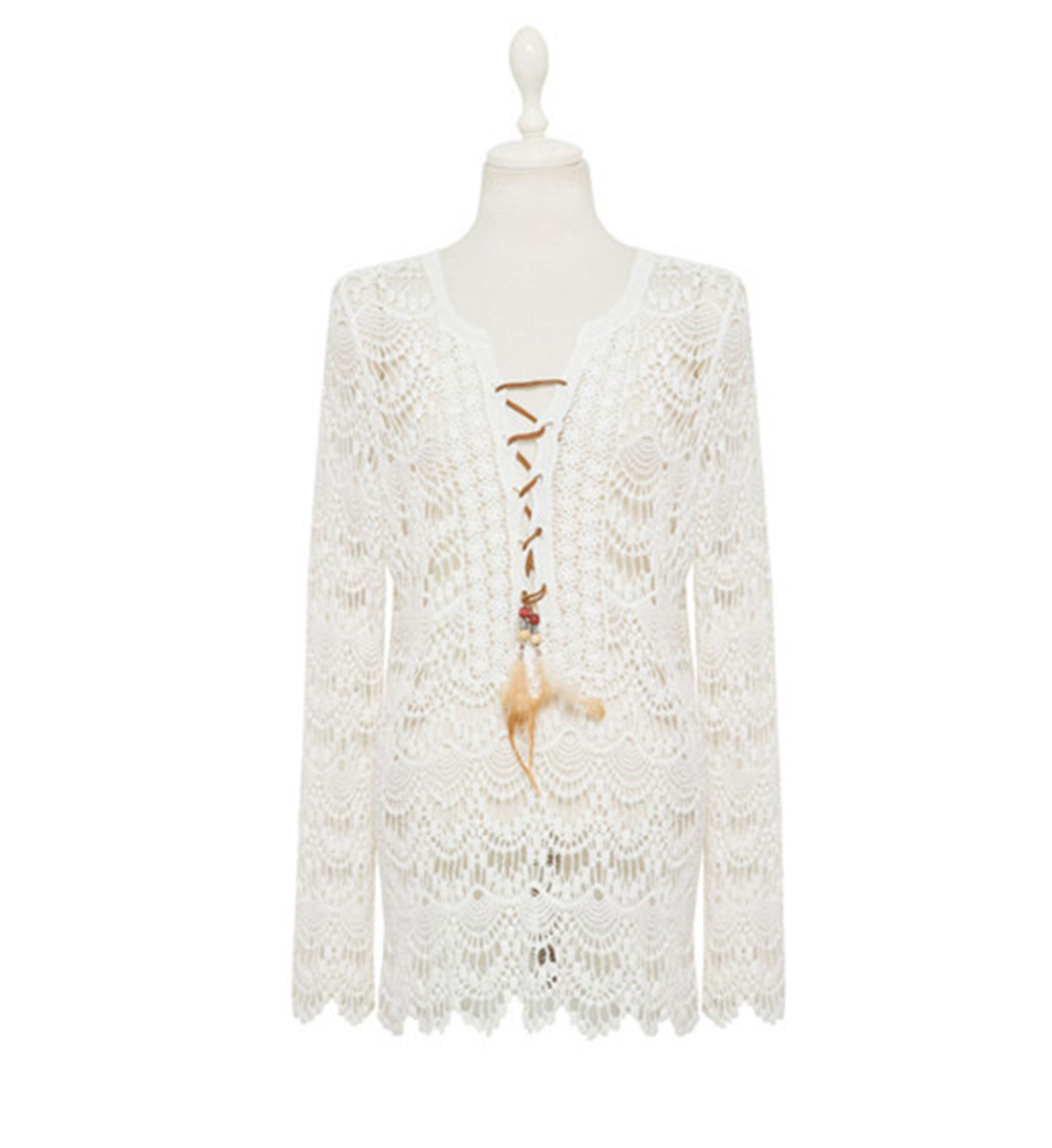 Bohemia style lace cover ups for bikini swimsuit, patterned hollow out design and special tie up drawstring front design, and tassel at both side of the drawstring is the spotlight. Show off your feminist with this white cover ups to be focused now.