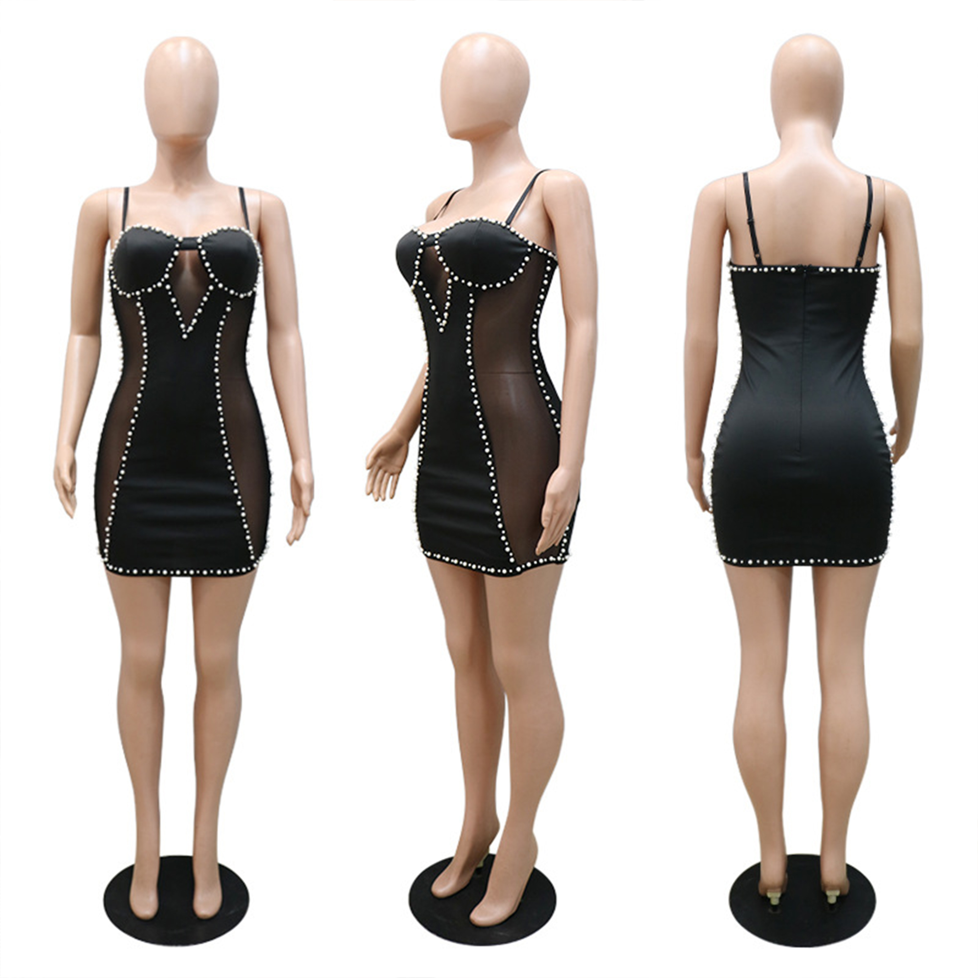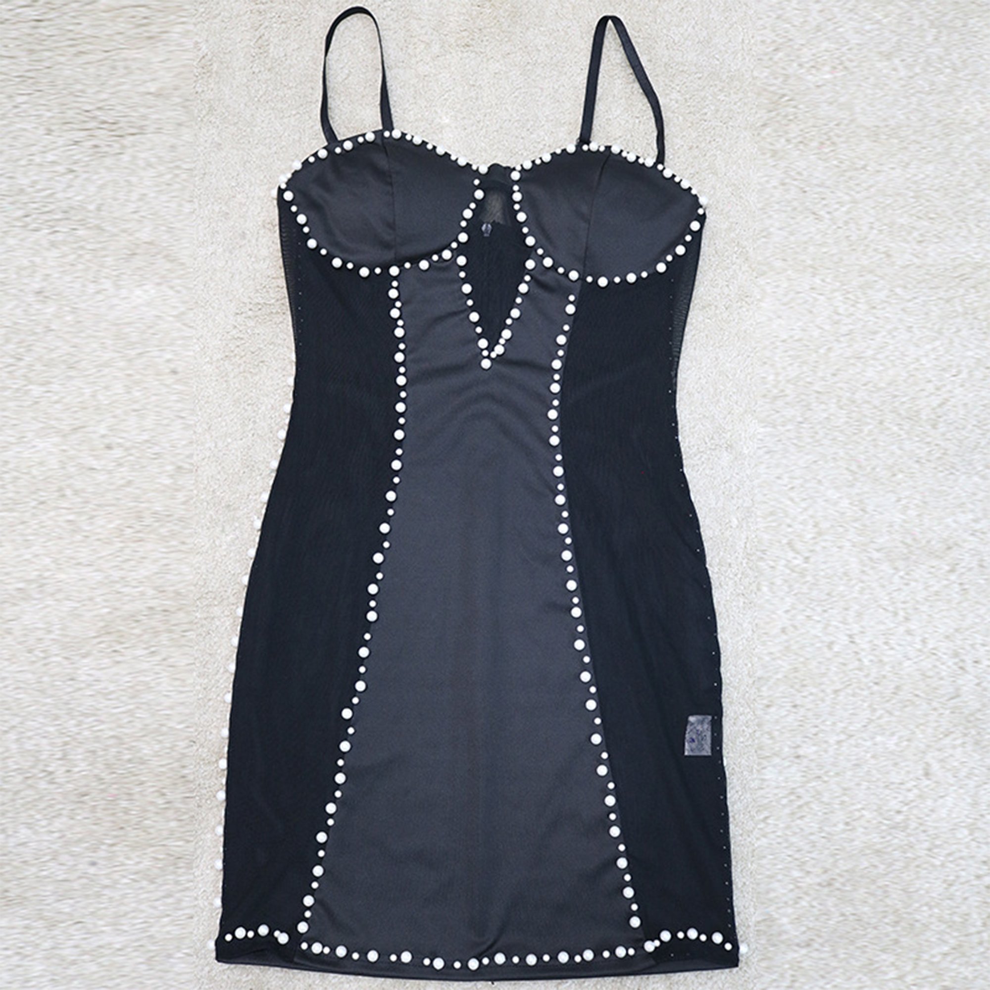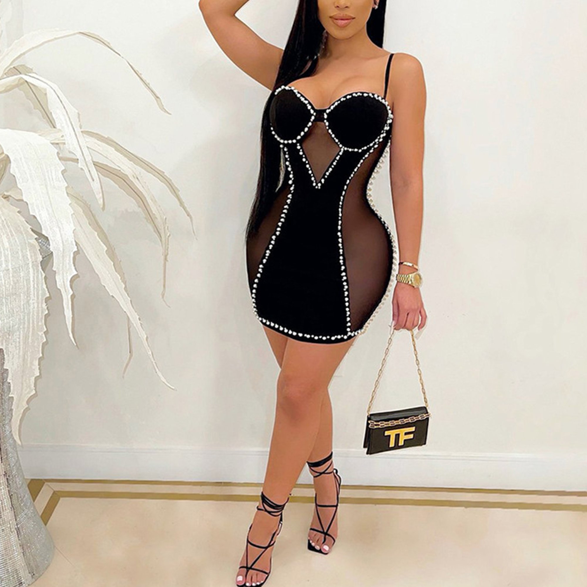 See Through Beading Trimmed Bodycon Mini Party Dress with Spaghetti Straps