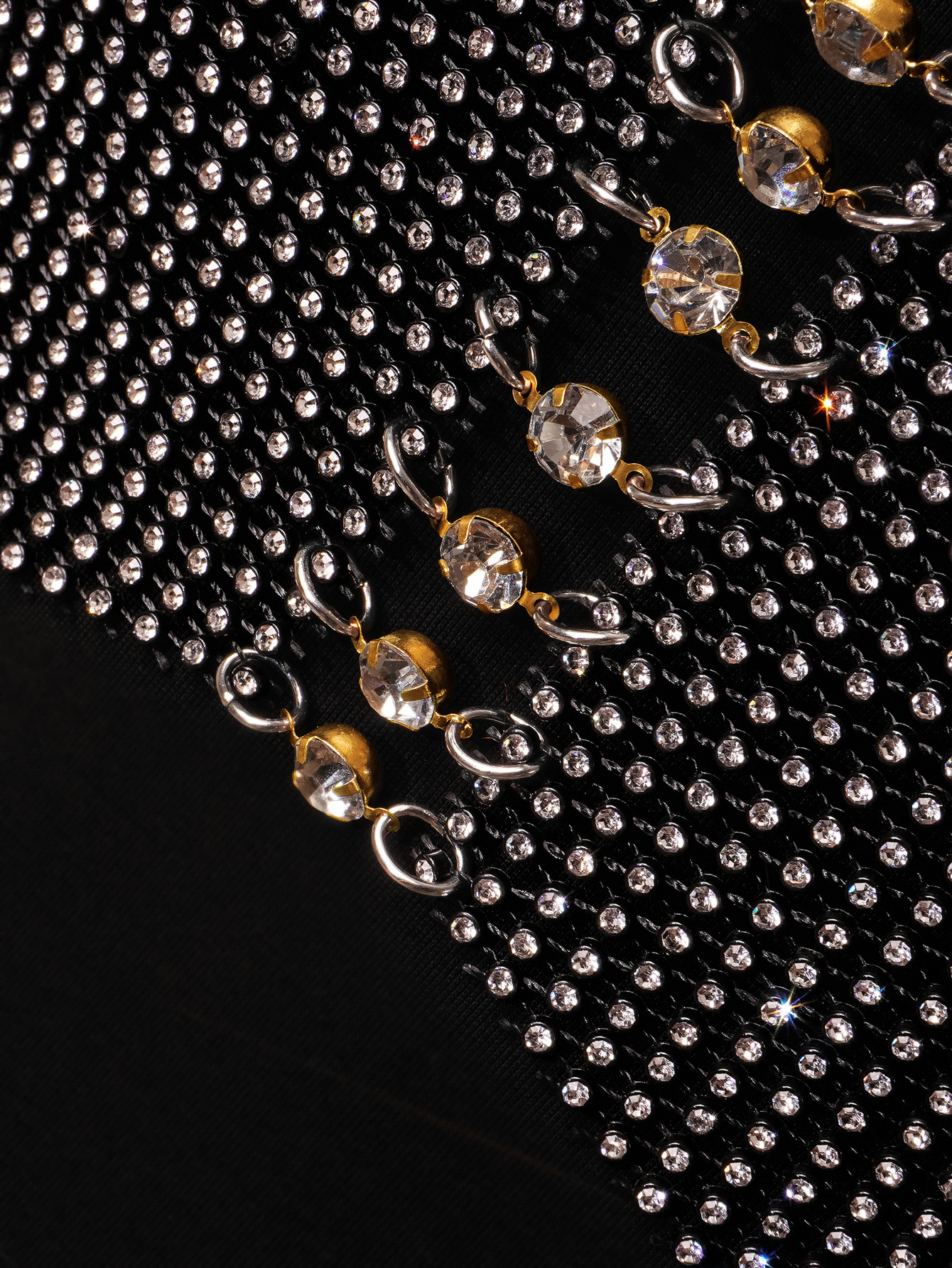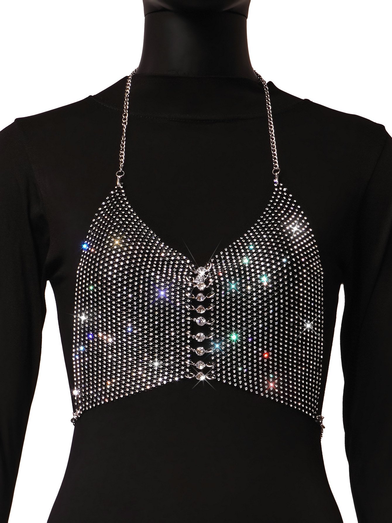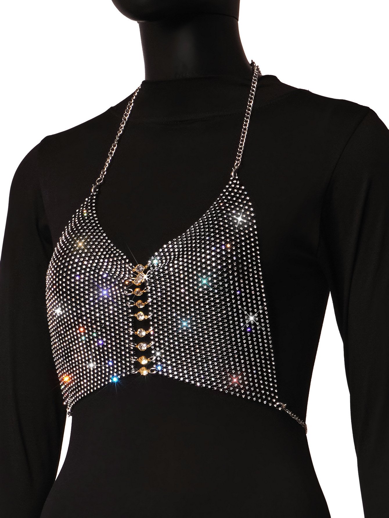 Black Golden Sparkly Halter Crystaled Bust Chain Small Net Vest