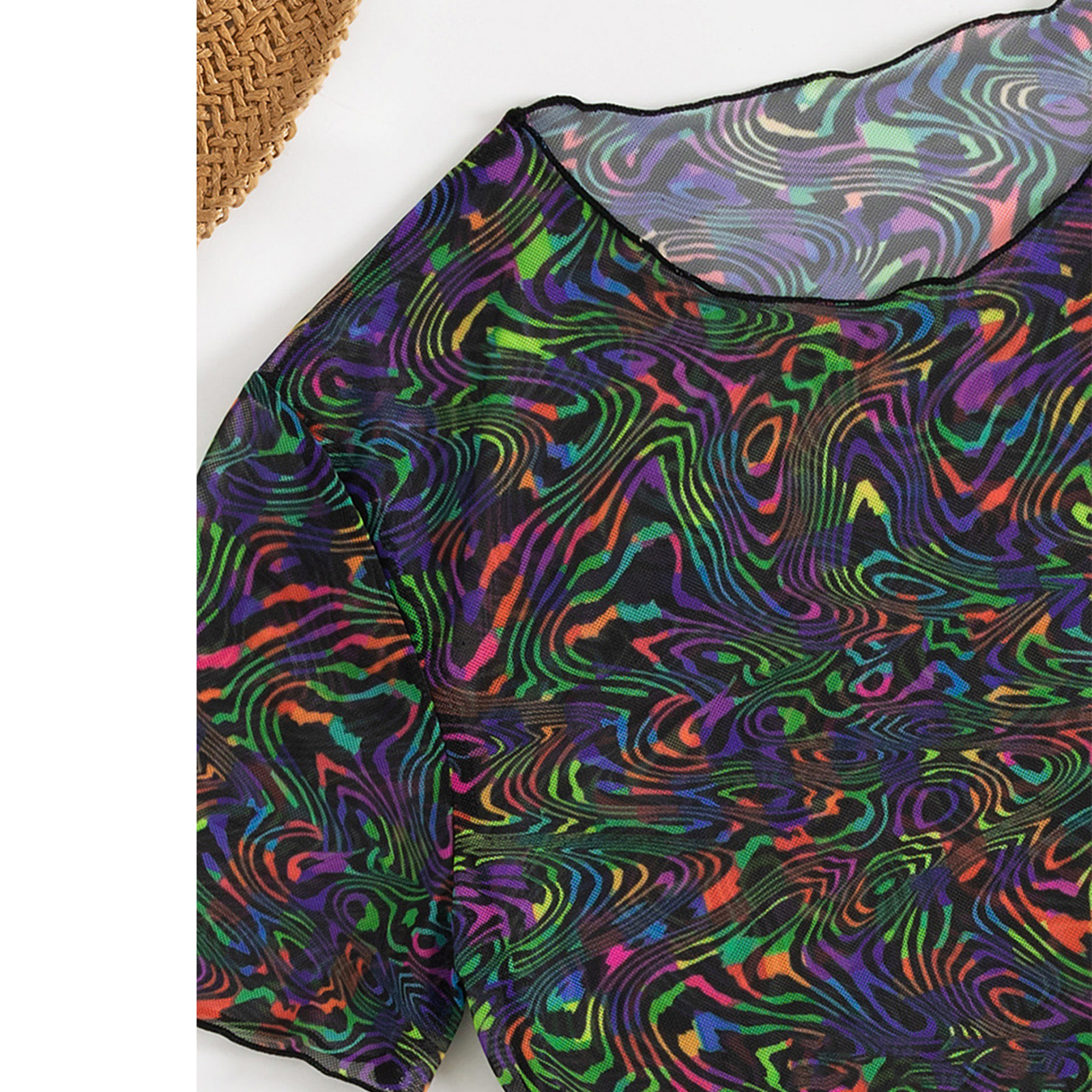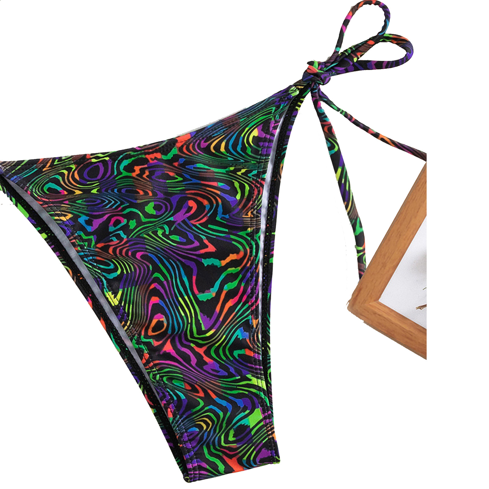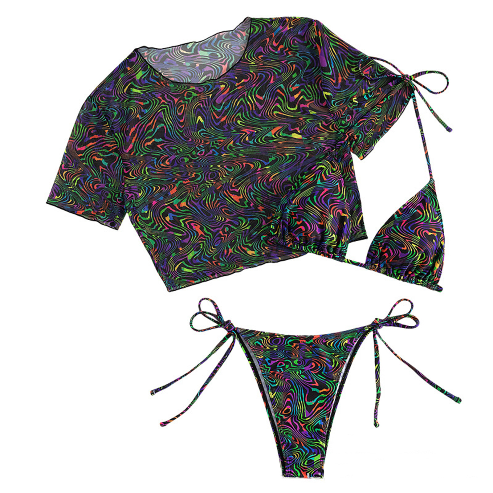 This sexy eyecatching bikini set for girls and women is made up with build-in bra, it is smooth, soft and stretch, breathable and easy dry.Womens fashion sexy 3PCS bikini swimsuit set with triangle halter tie up top and see through crop top coverup, and triangle bottom with strappy tie up side, that made with dark spectrum wave printed fabric, easy to adjust according requirement and special on the beach, seaside, pool party, etc.This wire-free swimwear for women is fits true to size, take your normal size. Swim like A-lister with this girls swimsuit now.