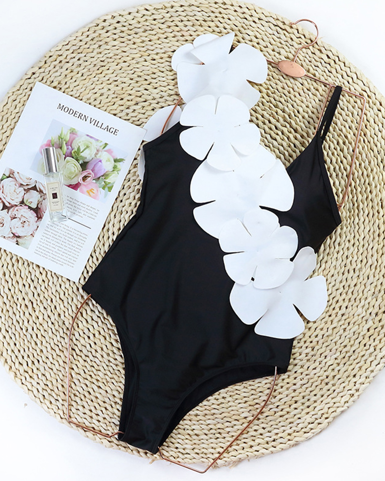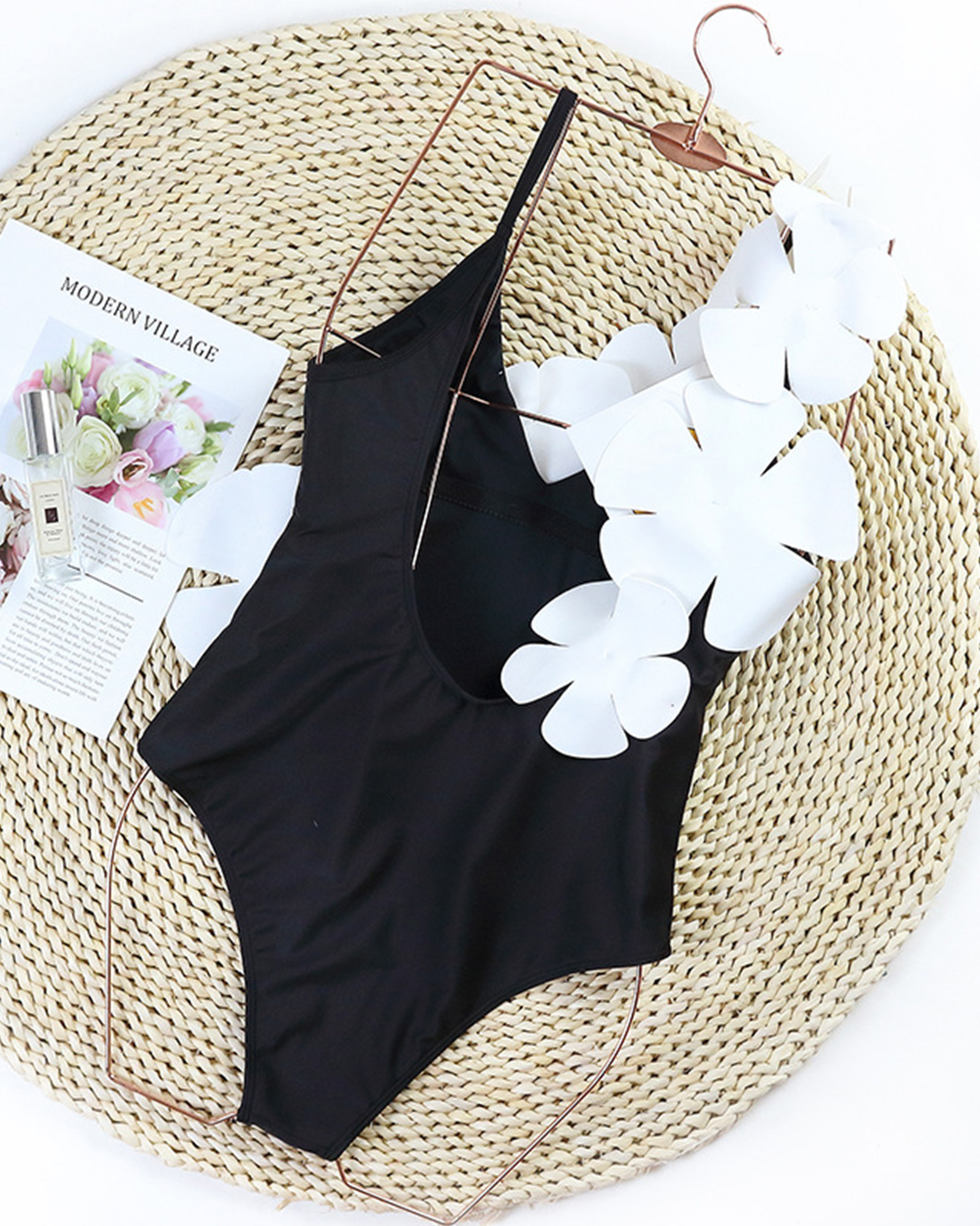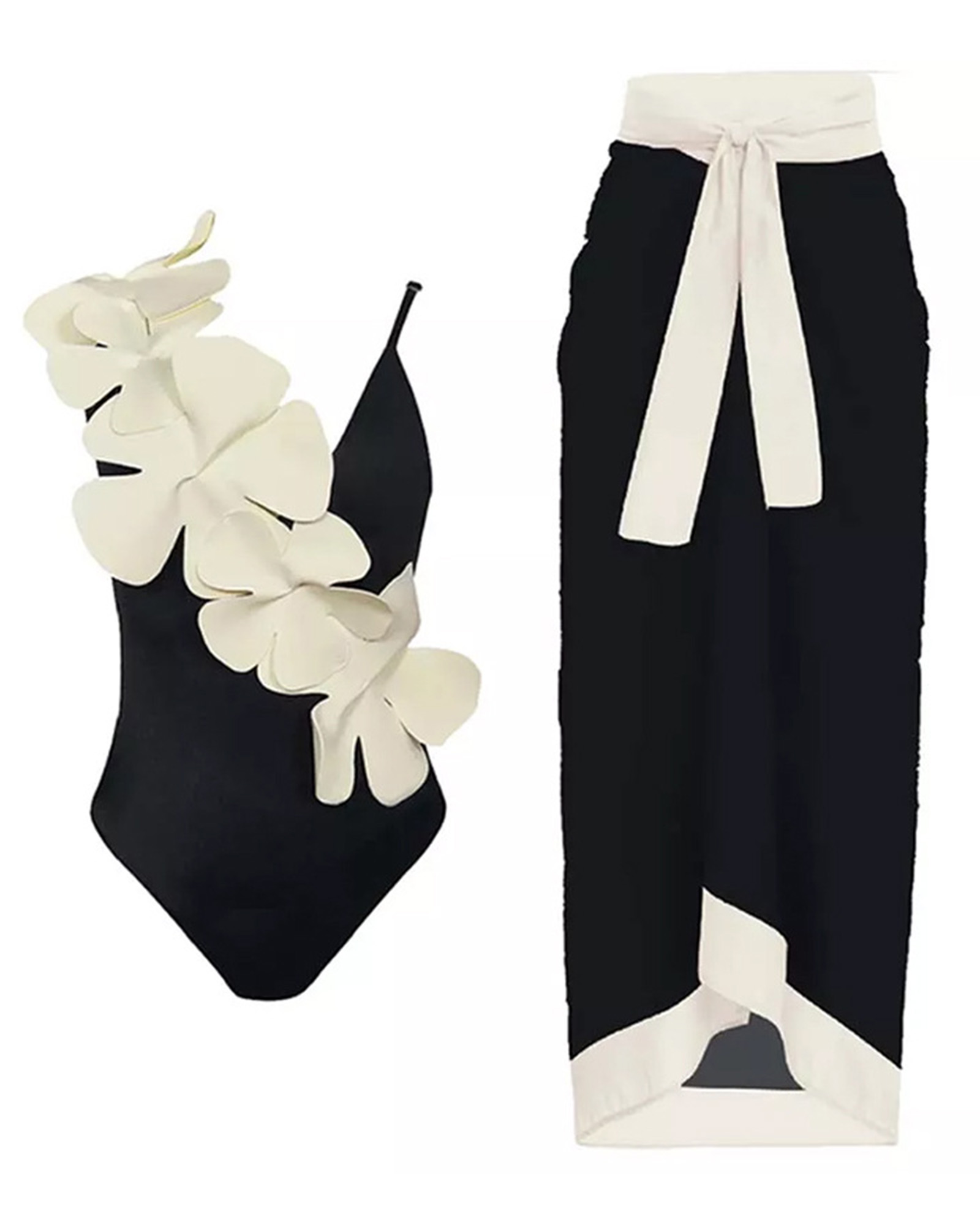 Black One Piece Swimsuit Big White Flower Adjustable Bathingsuit Sarong Coverups