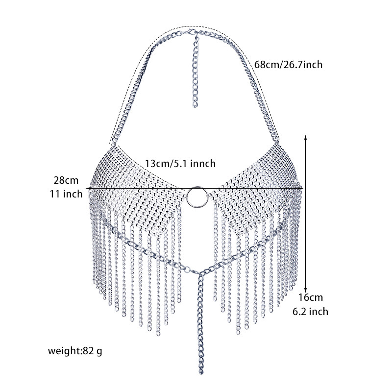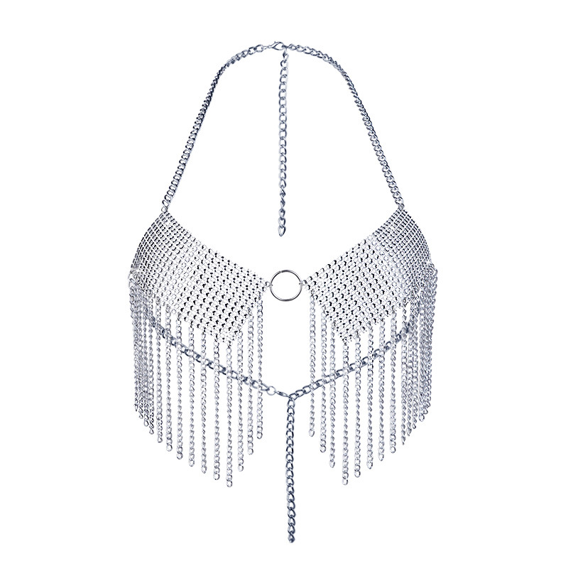 The high quality and nickle free plastic material make up the halter style neckline leaving your back sexily exposed, while the chain fringe provides a tantalizing peek at your underbust.