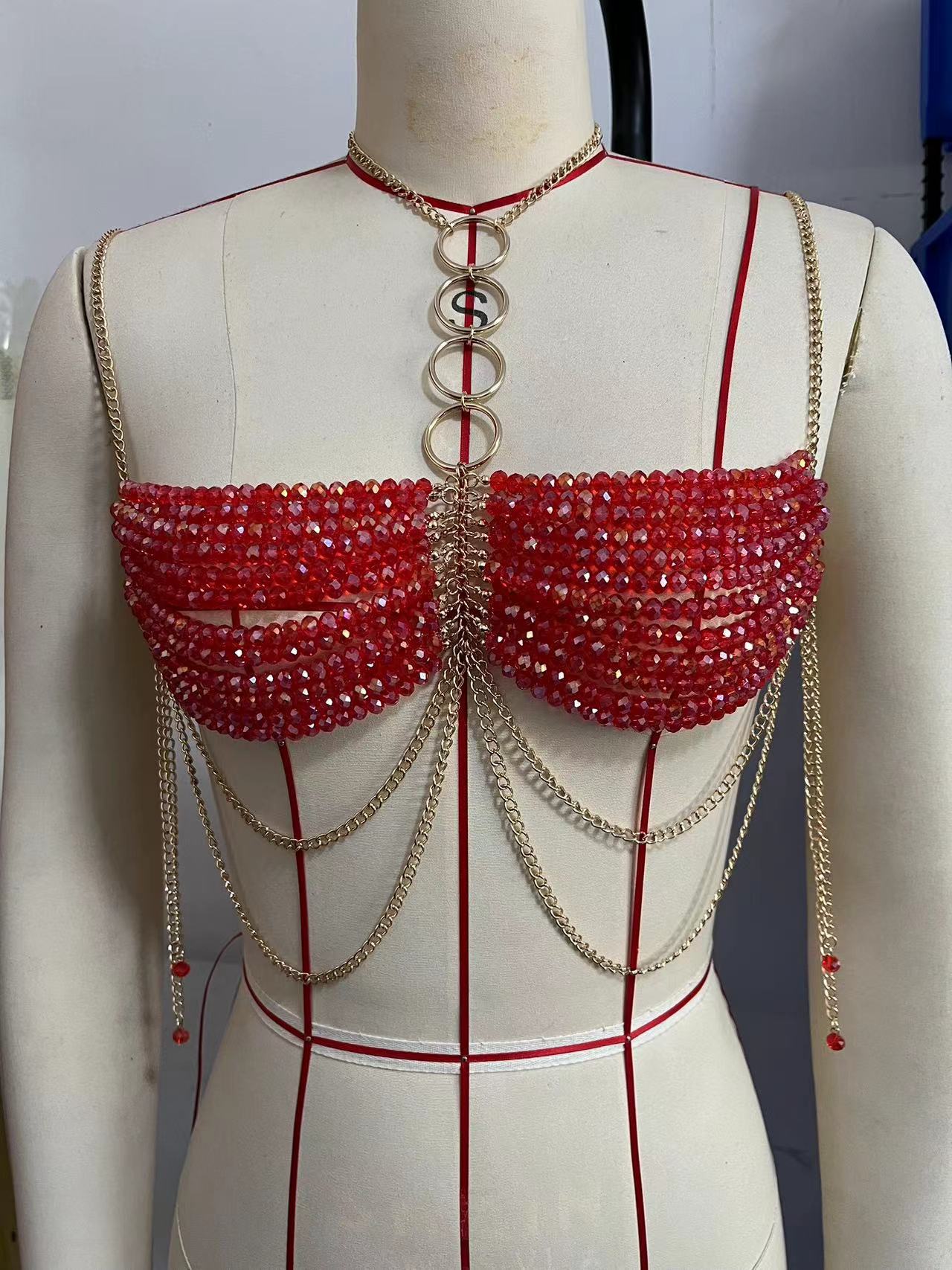 Red Beaded Bralette With Multi-layered Gold Chain Festival Party Clubwear