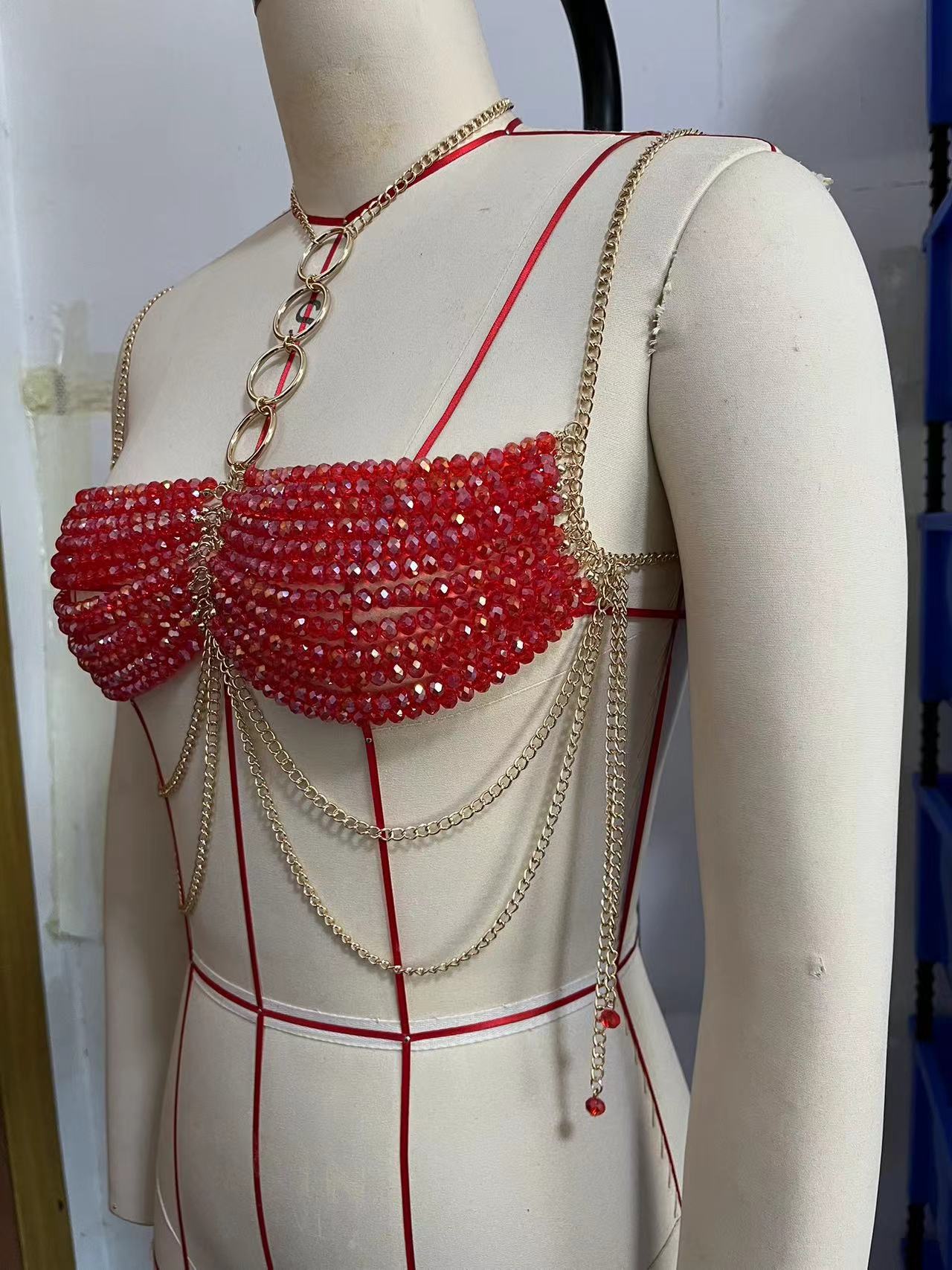 Make a stunning statement with this glamorous crystal chain bralette top. Featuring luxurious red crystal beading arranged in an eye-catching design, this piece combines elegance with bold style. The intricate gold-tone chain details cascade beautifully, creating dramatic draping effects that catch and reflect light. Multiple chains connect to stylish circular links, adding sophisticated detail to the overall design. Perfect for festival wear, special occasions, or statement clubwear, this versatile piece can be styled in multiple ways. The red crystal embellishments create a dazzling effect while the metallic chains add an edgy, contemporary touch. This bralette top showcases expert craftsmanship with secure construction and attention to detail in every crystal and chain placement. The design offers a perfect balance of sparkle and sophistication, making it an ideal choice for those looking to make a bold fashion statement. Each piece features carefully arranged crystal beading and precisely positioned chains for maximum impact and style.