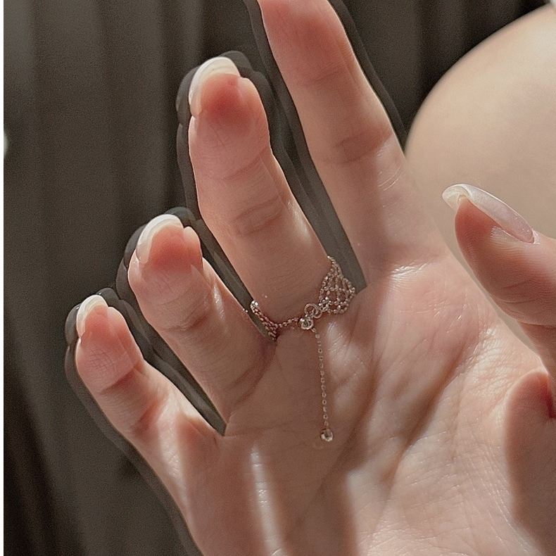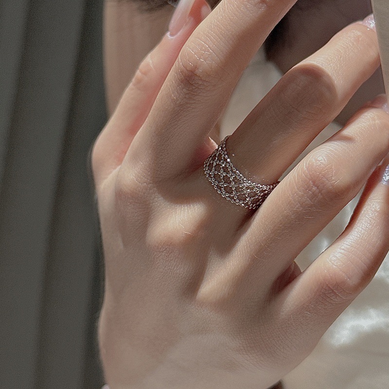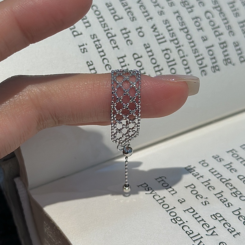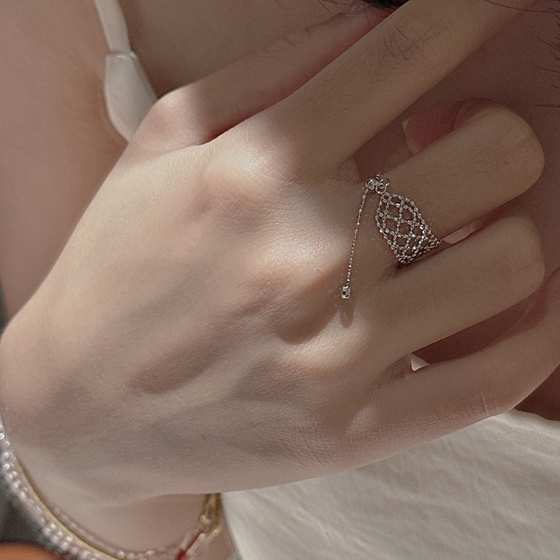 The intricate weave net pattern creates a delicate latticework in silver-plated metal that wraps gracefully around your finger. What makes this piece truly special is its innovative sliding chain design - a small decorative ball charm dangles from the adjustable chain, adding movement and vintage charm. The ring features an open-worked pattern that catches the light beautifully, creating a stunning visual effect whether worn alone or stacked with other rings. Its adjustable nature ensures a comfortable fit for various finger sizes, while the detailed metalwork showcases timeless craftsmanship inspired by historical designs. Perfect for adding a touch of romantic, vintage-inspired elegance to any outfit, this statement ring combines classic aesthetics with modern wearability. The sophisticated lattice design and sliding element make it both a fascinating conversation piece and a versatile accessory for everyday wear.