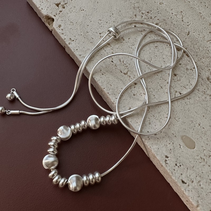 The sleek snake chain creates a fluid, contemporary look while providing durability and comfort. Adorned with a harmonious arrangement of larger brushed silver spherical beads interspersed with smaller decorative beads, this necklace strikes the perfect balance between modern minimalism and timeless appeal.