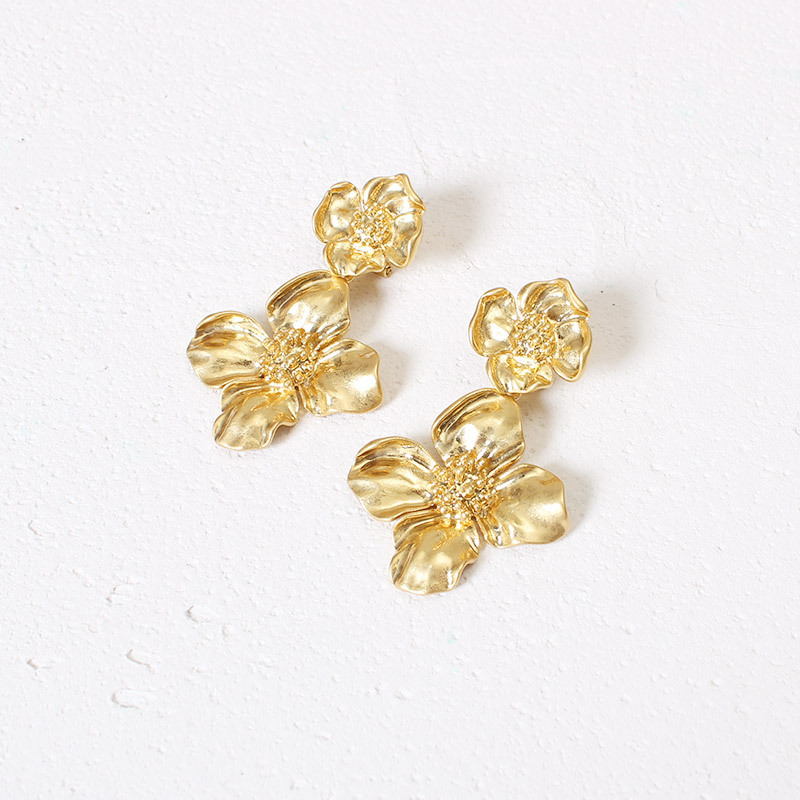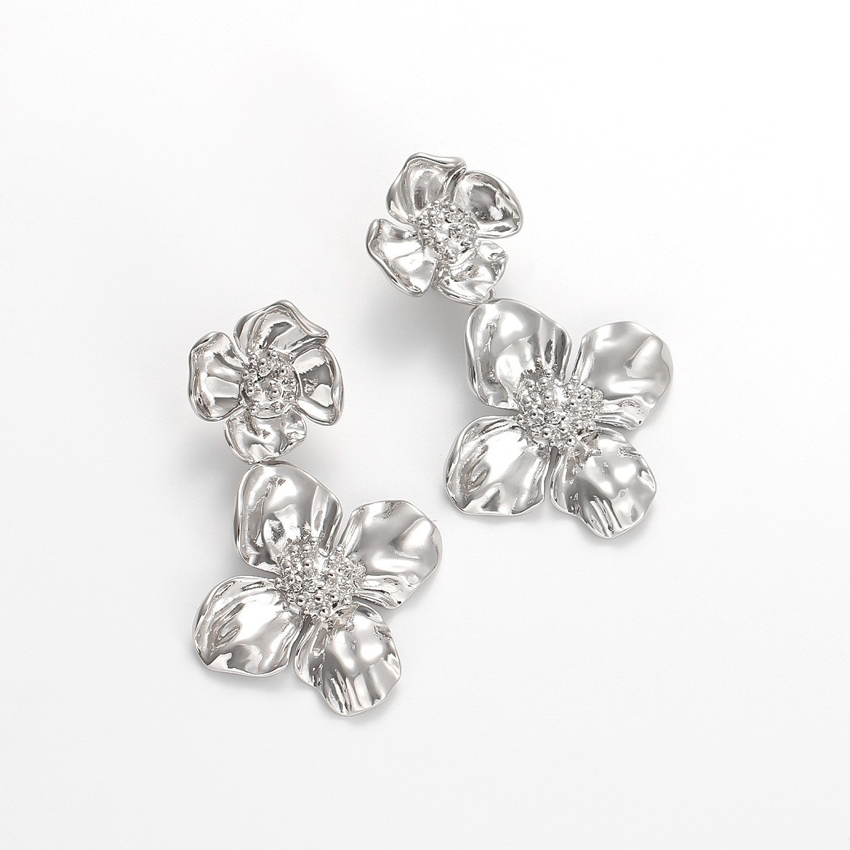 Make a stunning statement with these exquisite floral dangle earrings, available in both elegant gold and sophisticated silver finishes. Each earring features a beautiful double-flower design with a smaller bloom at the post transitioning into a larger, eye-catching flower below. The meticulously crafted petals showcase a textured, organic appearance with delicate details that catch and reflect light beautifully. The center of each flower is adorned with sparkling crystal embellishments, adding just the right amount of glamour. Crafted with S925 needle posts for sensitive ears, these earrings are both comfortable and secure. The gilded copper construction provides durability while maintaining a luxurious appearance. Perfect for both special occasions and adding a touch of elegance to everyday wear, these versatile earrings complement any outfit from casual to formal. The dimensional design creates movement and drama, while the classic floral motif ensures timeless appeal. Each flower measures approximately 1 inch in diameter, creating a bold yet balanced statement piece.